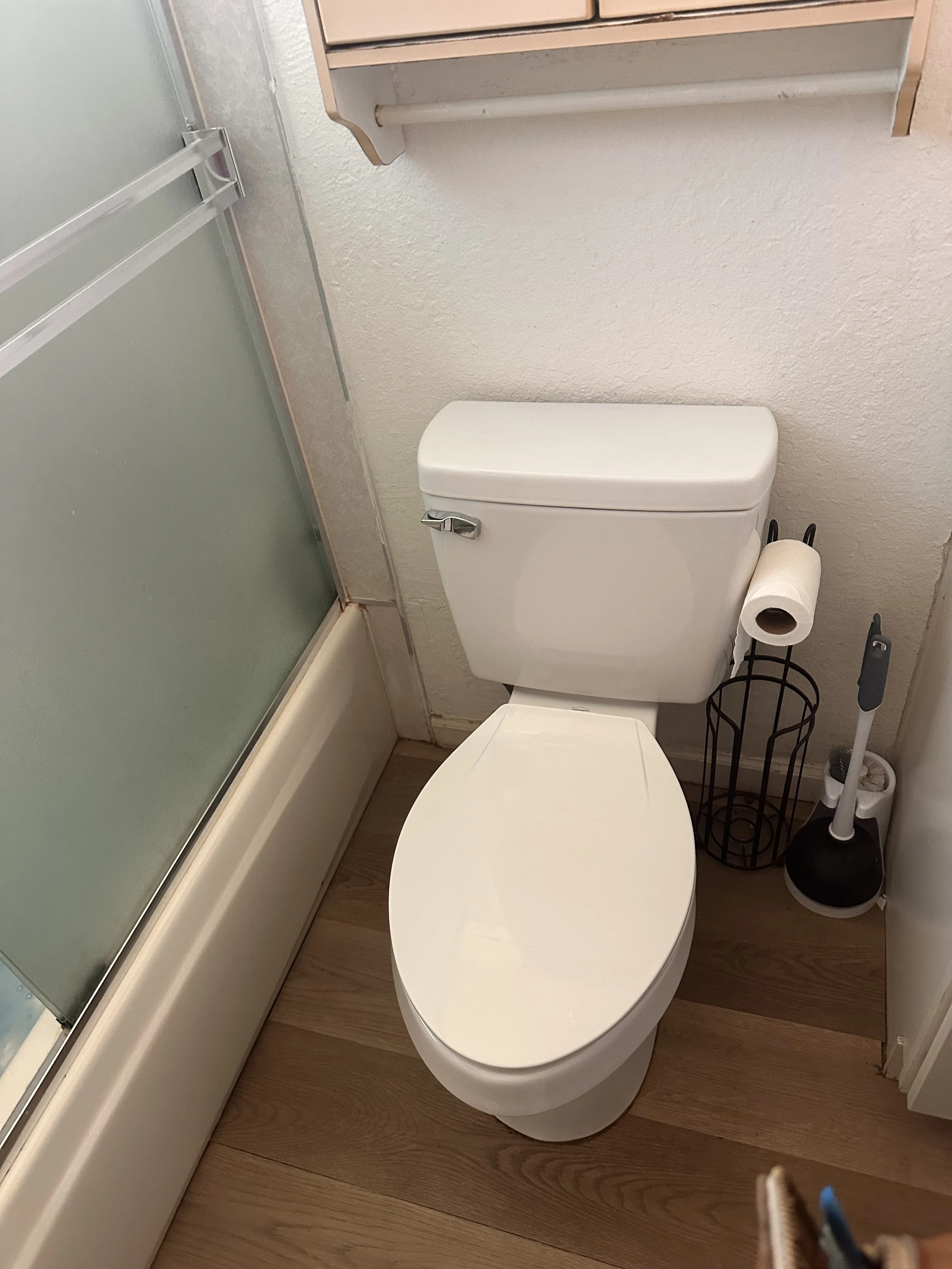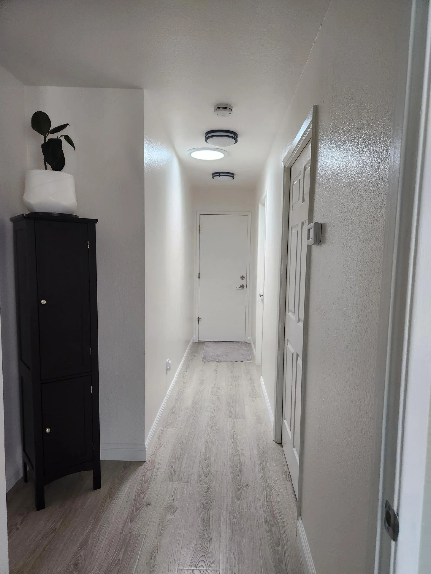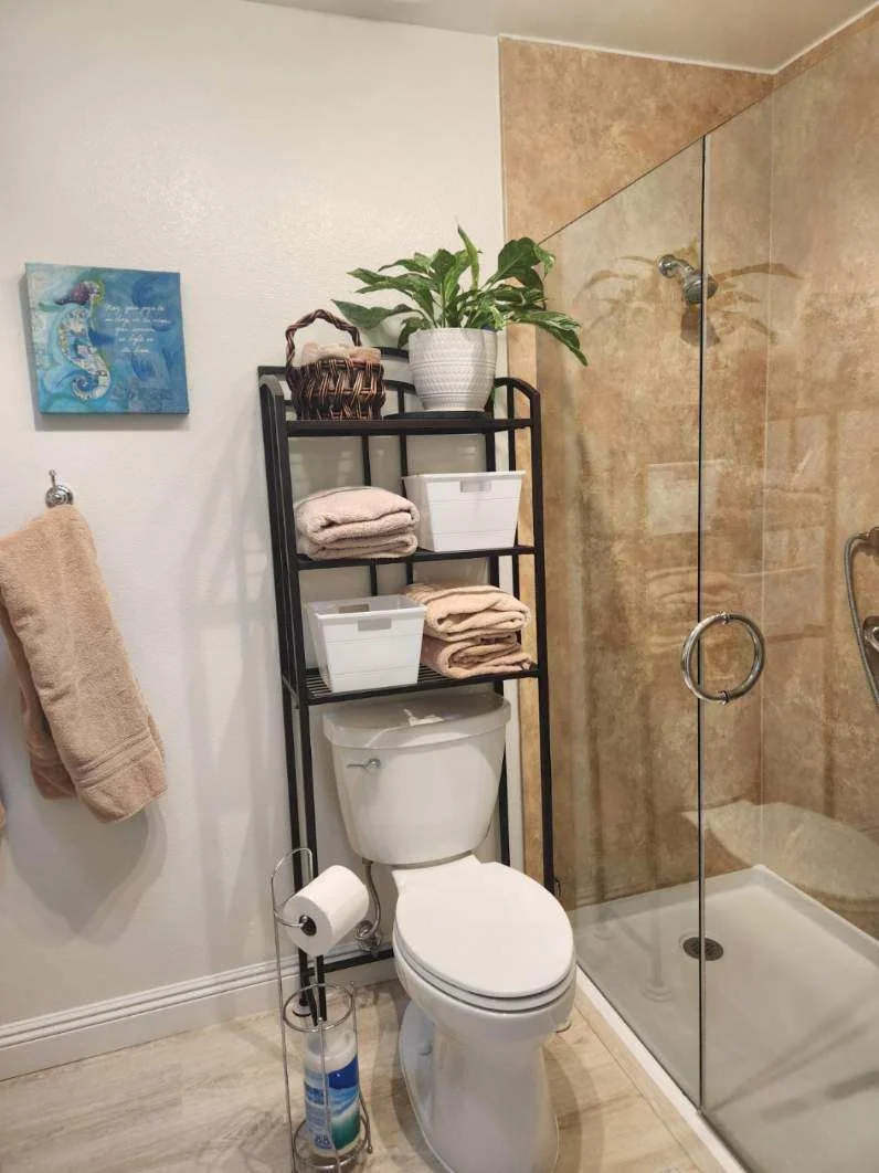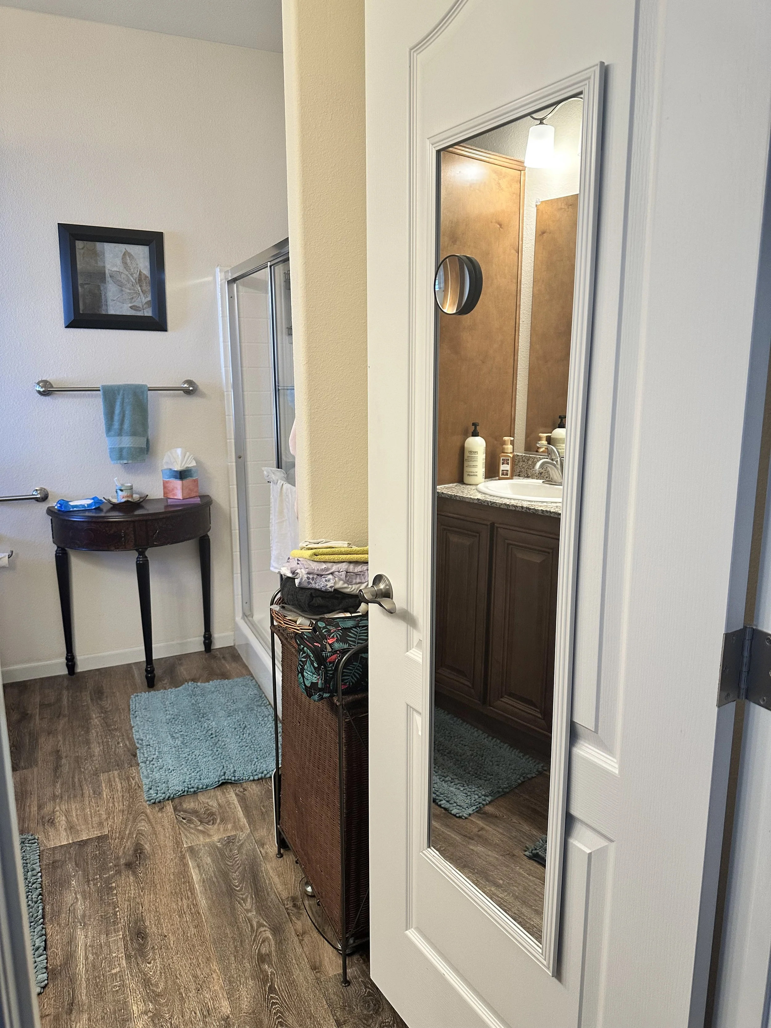 Bathroom with wooden floor, blue rugs, and a vanity with mirror. A towel rack with a blue towel is on the wall, and a wicker basket holds folded clothes and items. A framed picture hangs above a small wooden table. The bathroom door has a full-length mirror.
