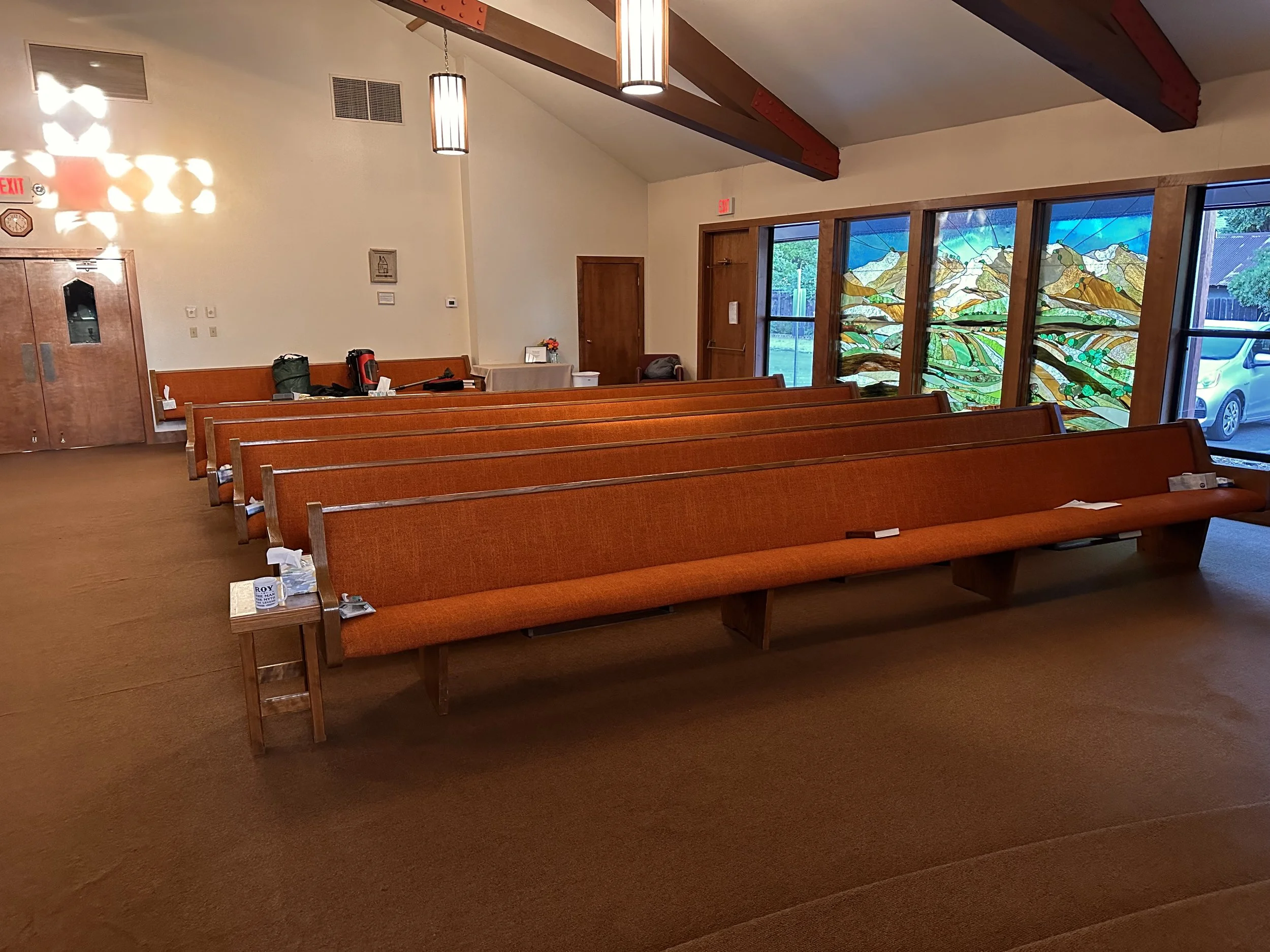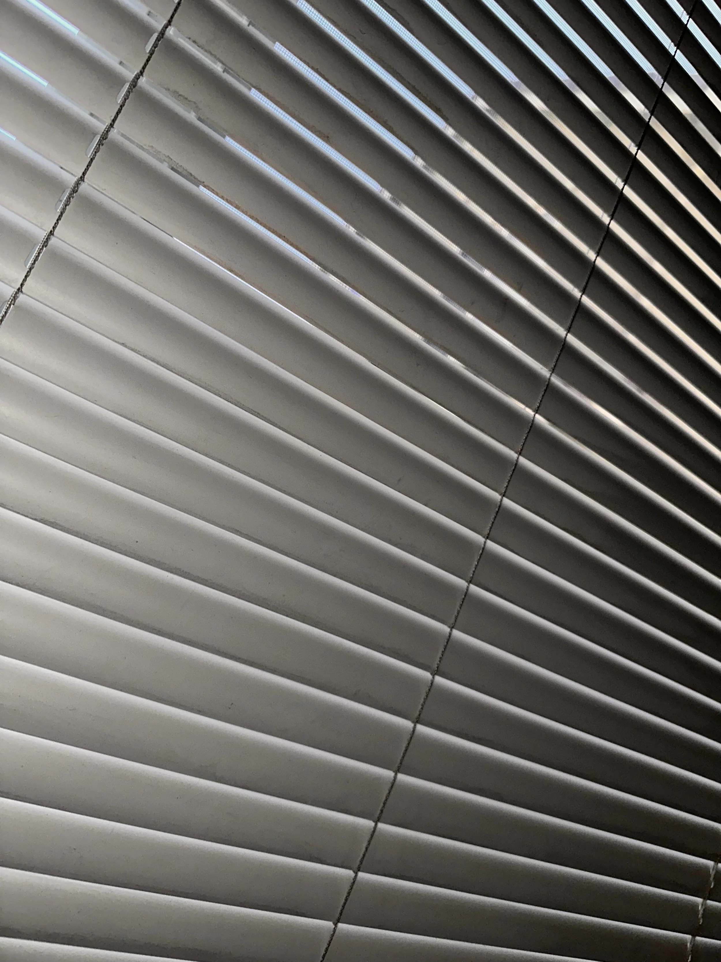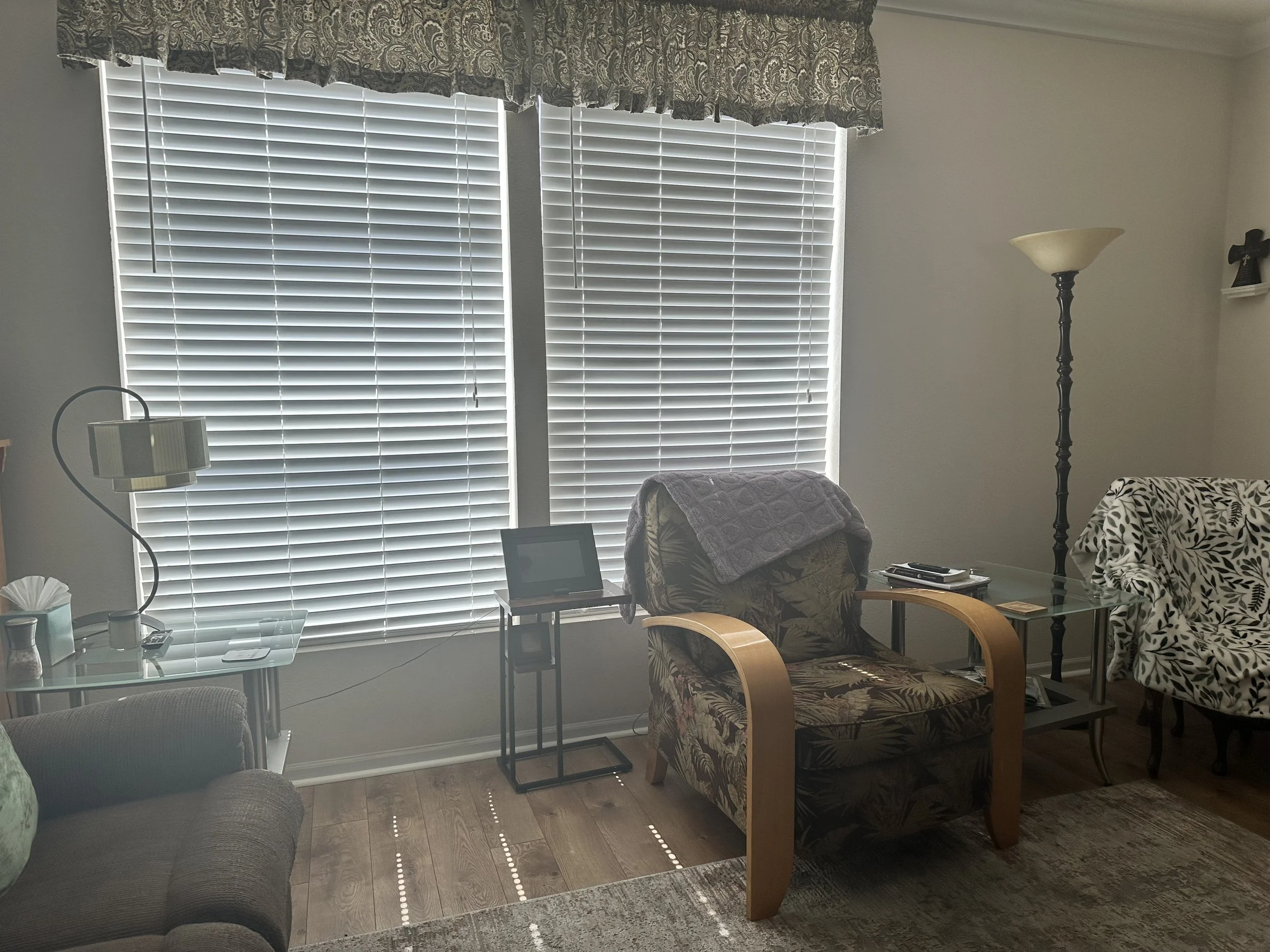 Living room with large windows, blinds, a patterned armchair, side tables with lamps, a digital device on a stand, and a patterned throw blanket on the couch.