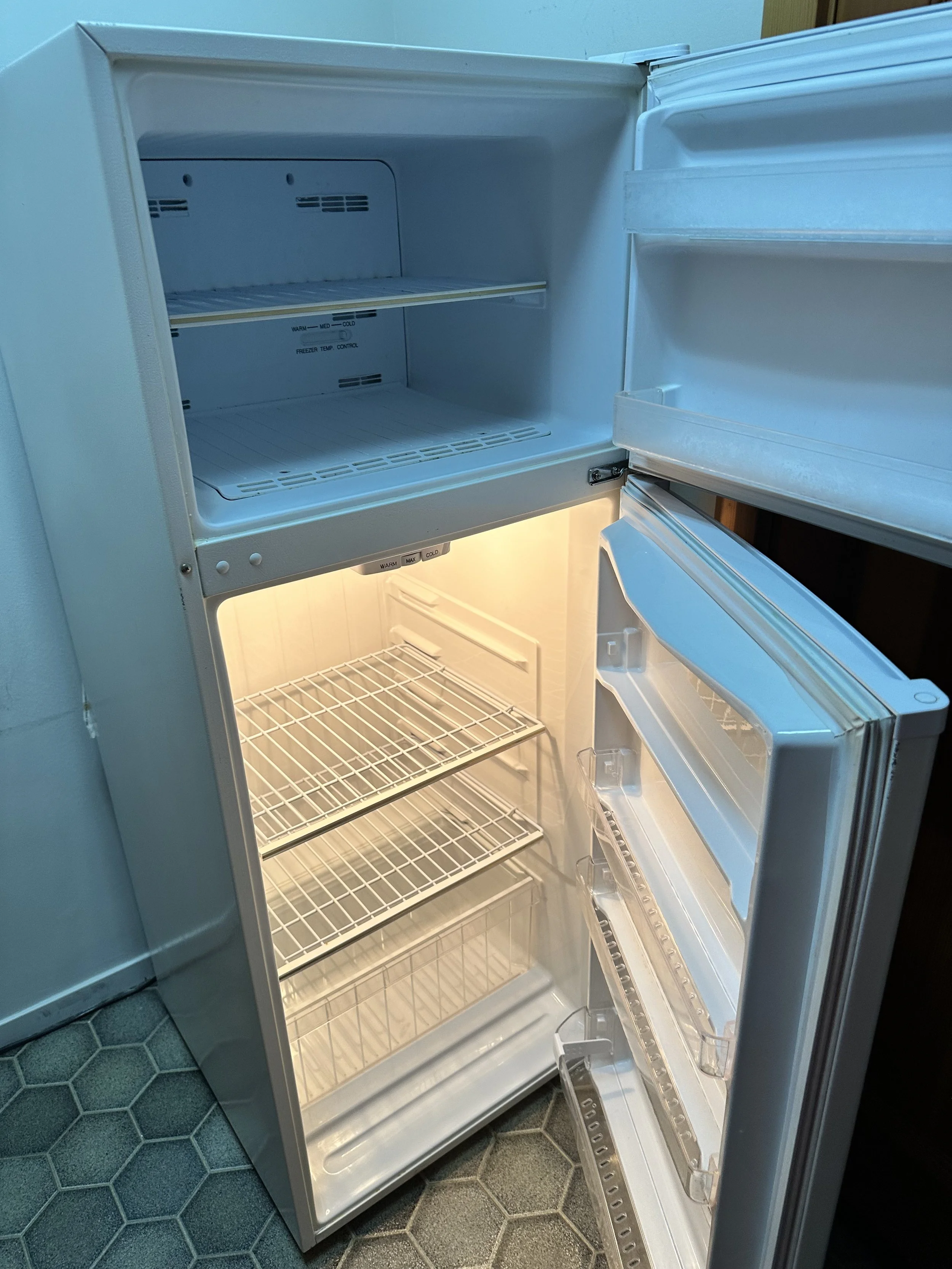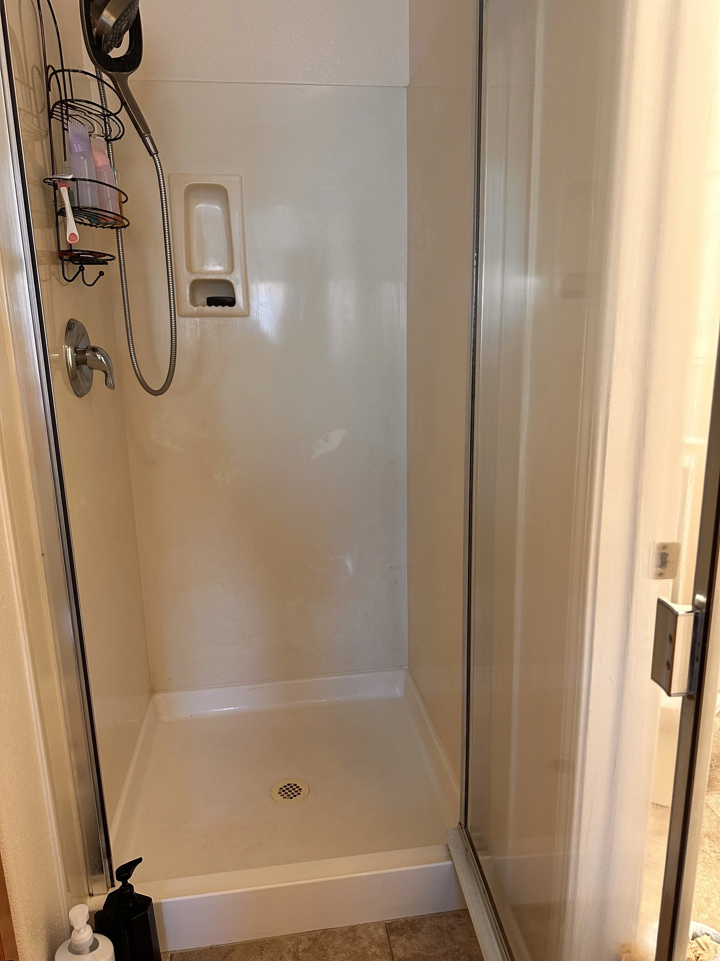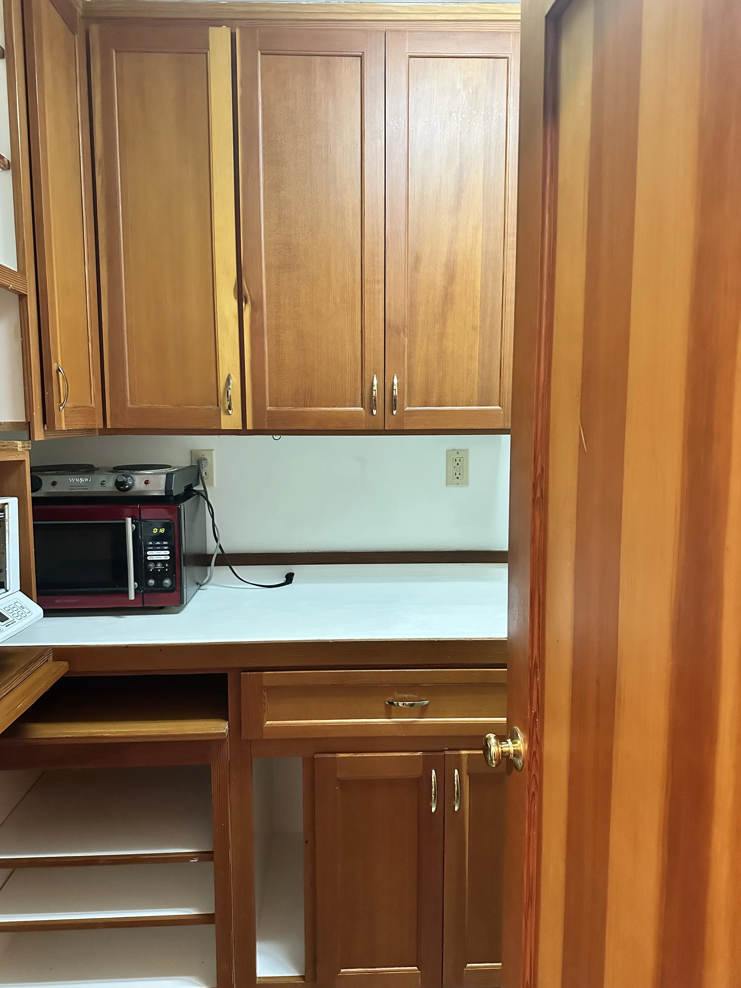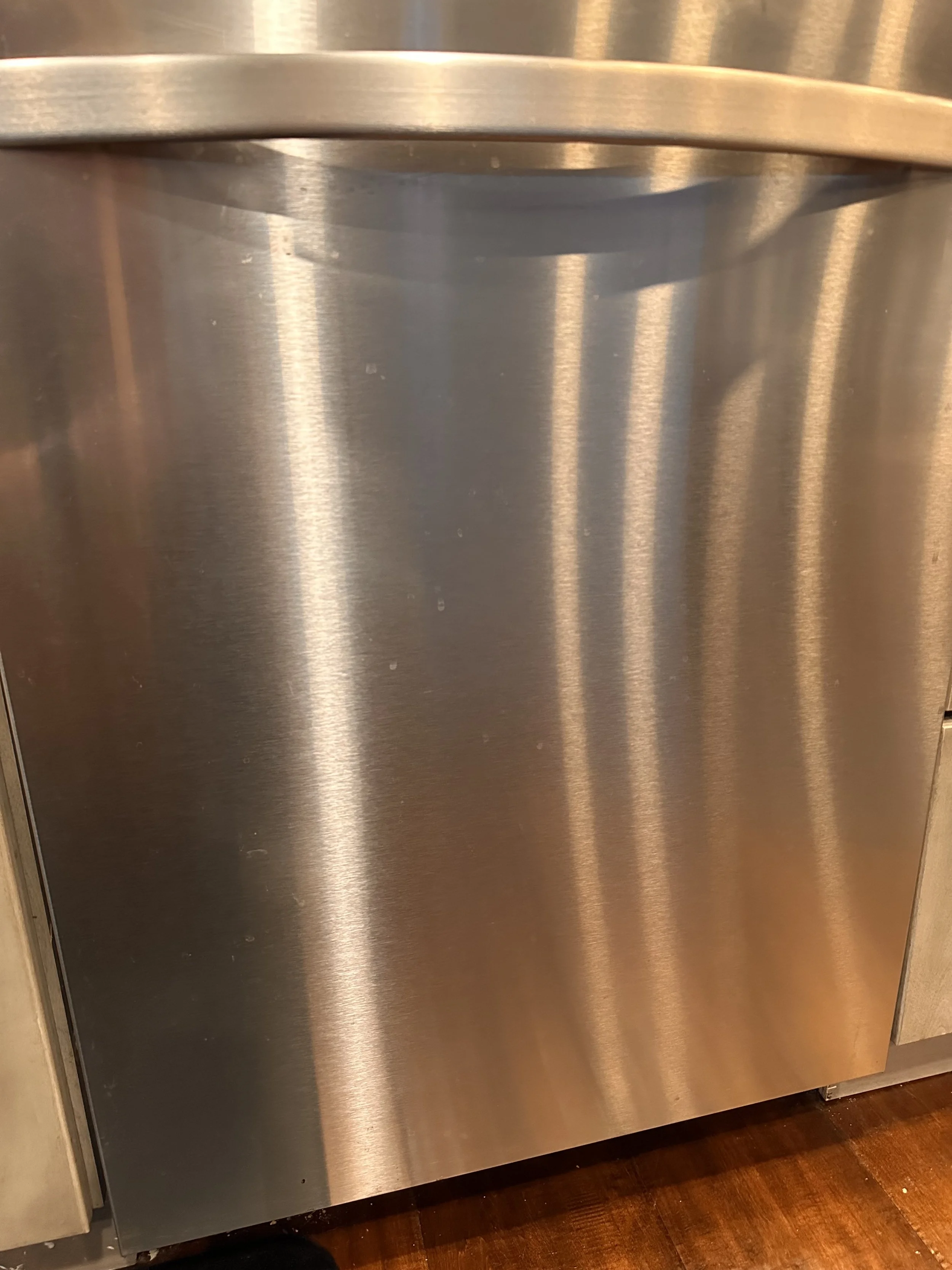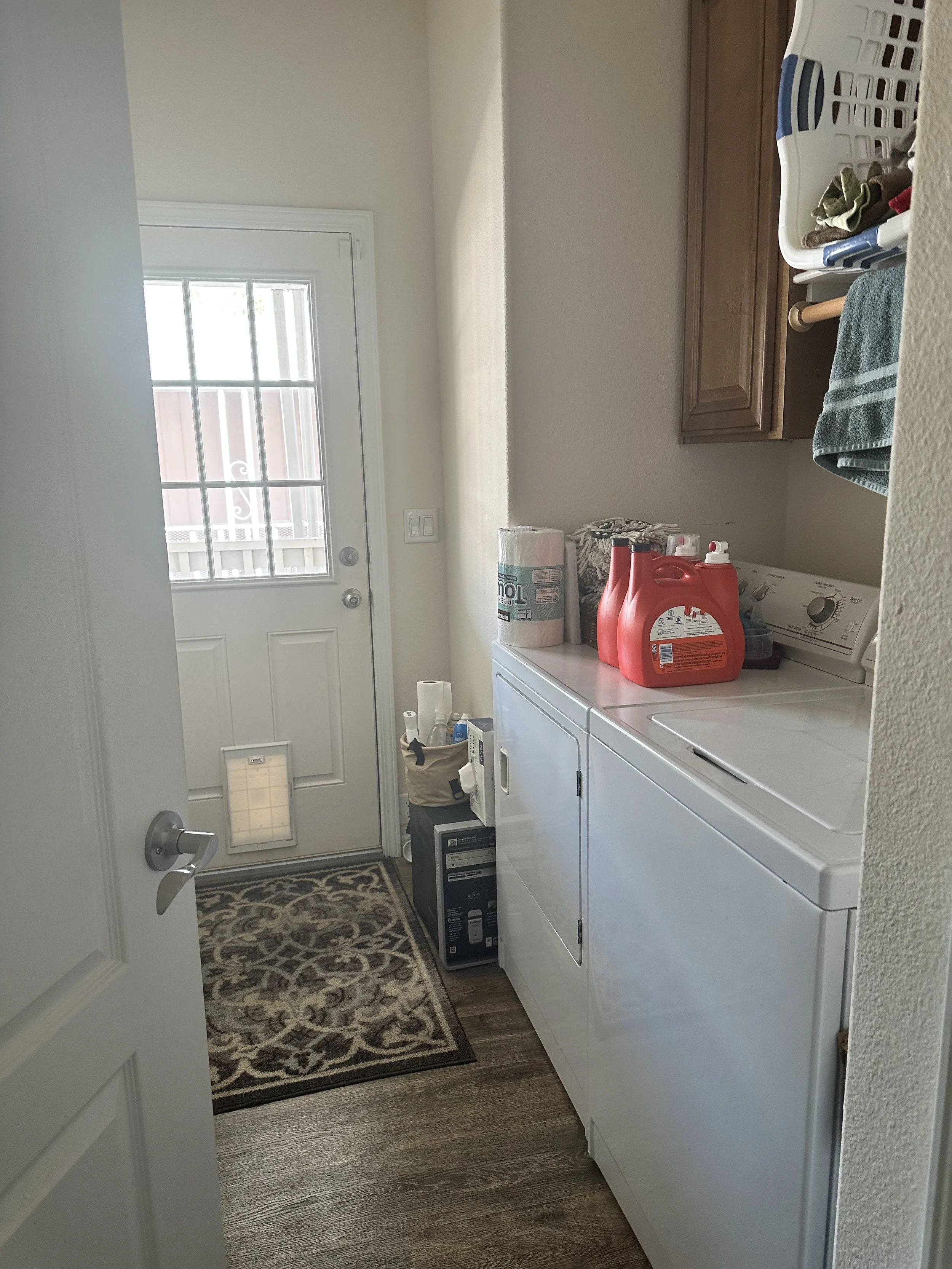 Laundry room with washing machine, dryer, detergent, laundry basket, and towels. Door with pet door on left, rug on wooden floor.