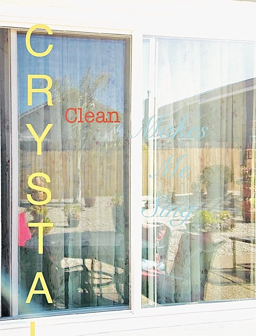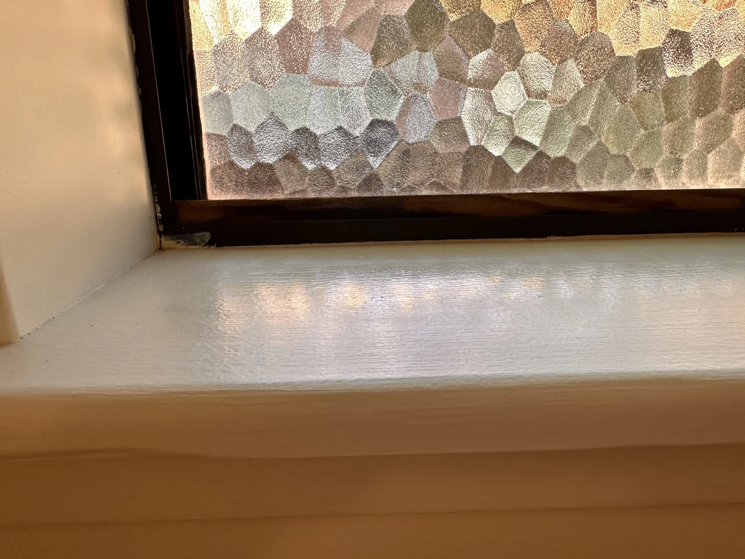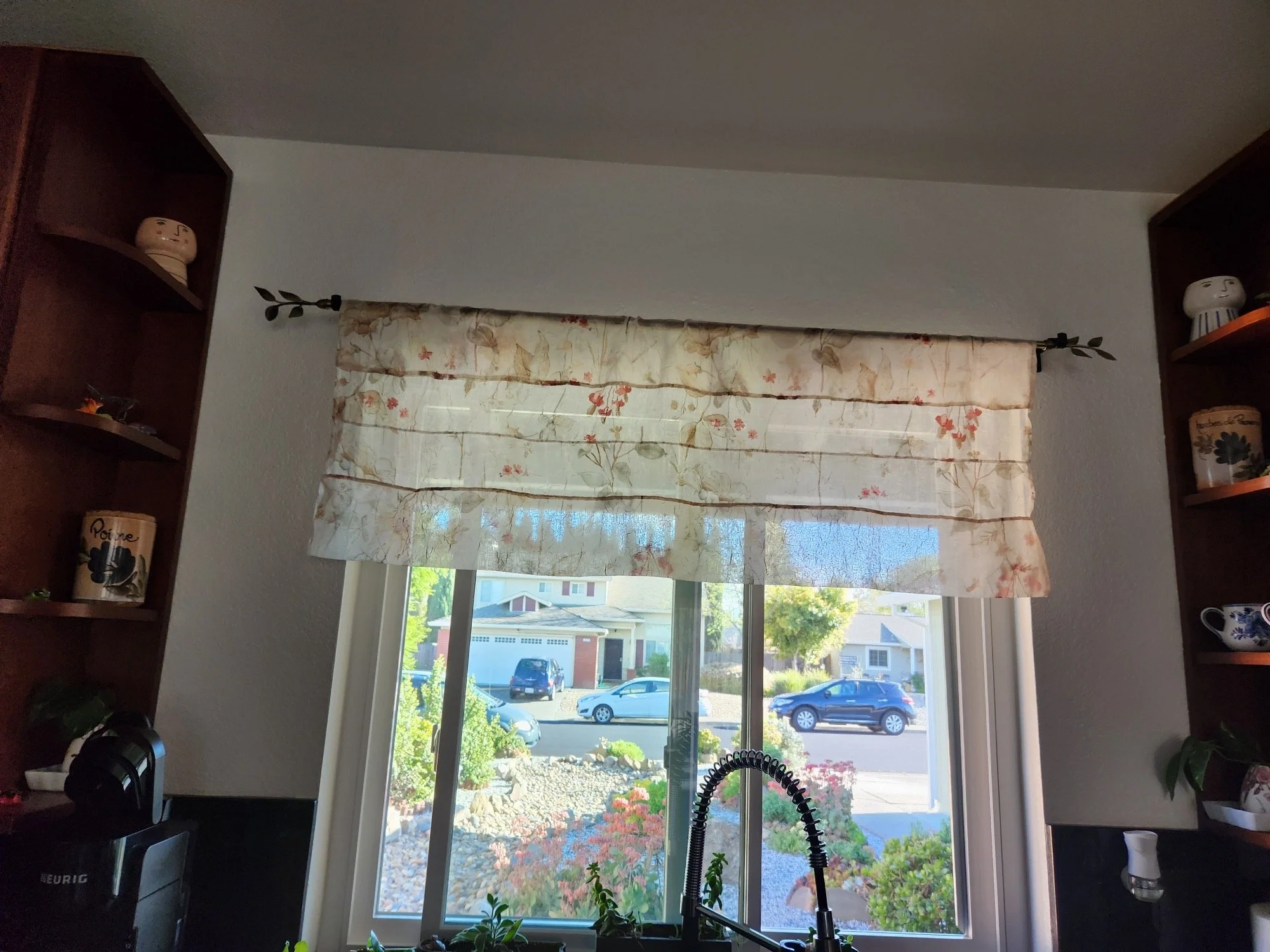 Interior view of a kitchen window with floral curtains and outside street view. Wooden shelves with decorative items are on either side of the window. A kitchen faucet and potted plants are in the foreground.