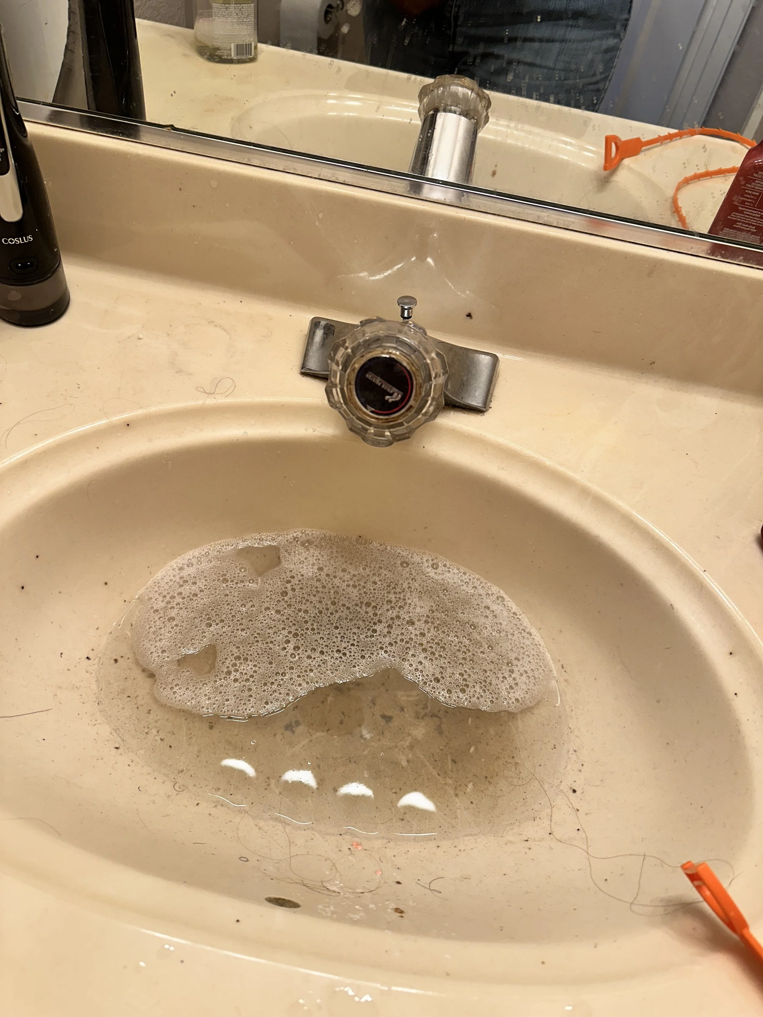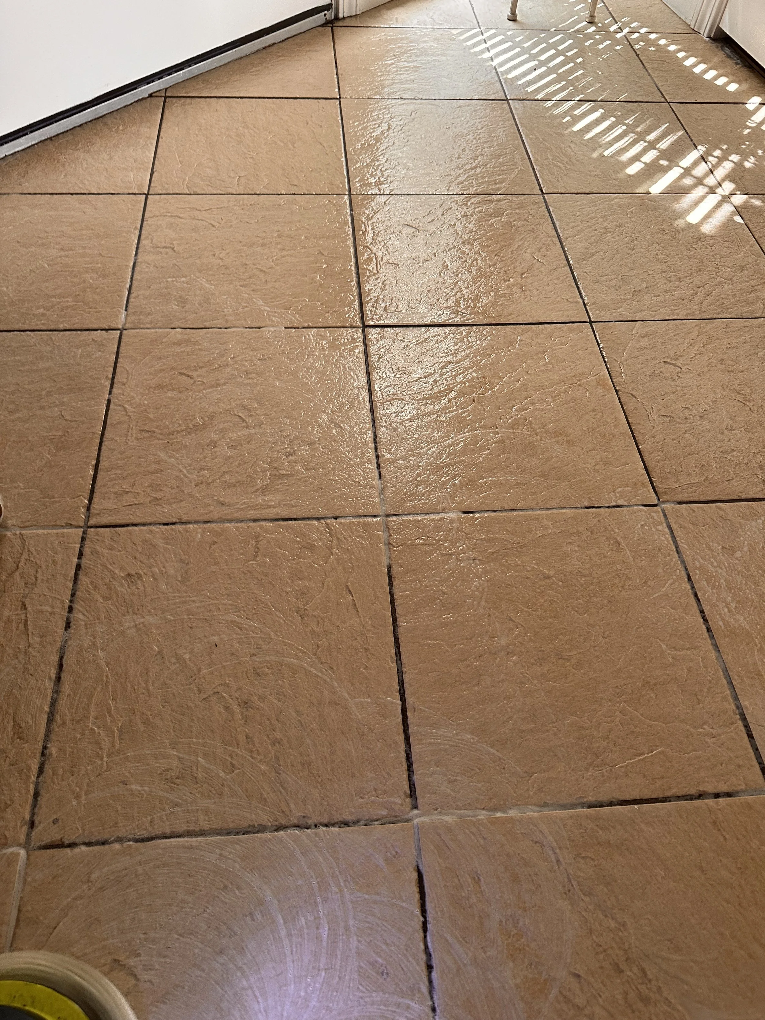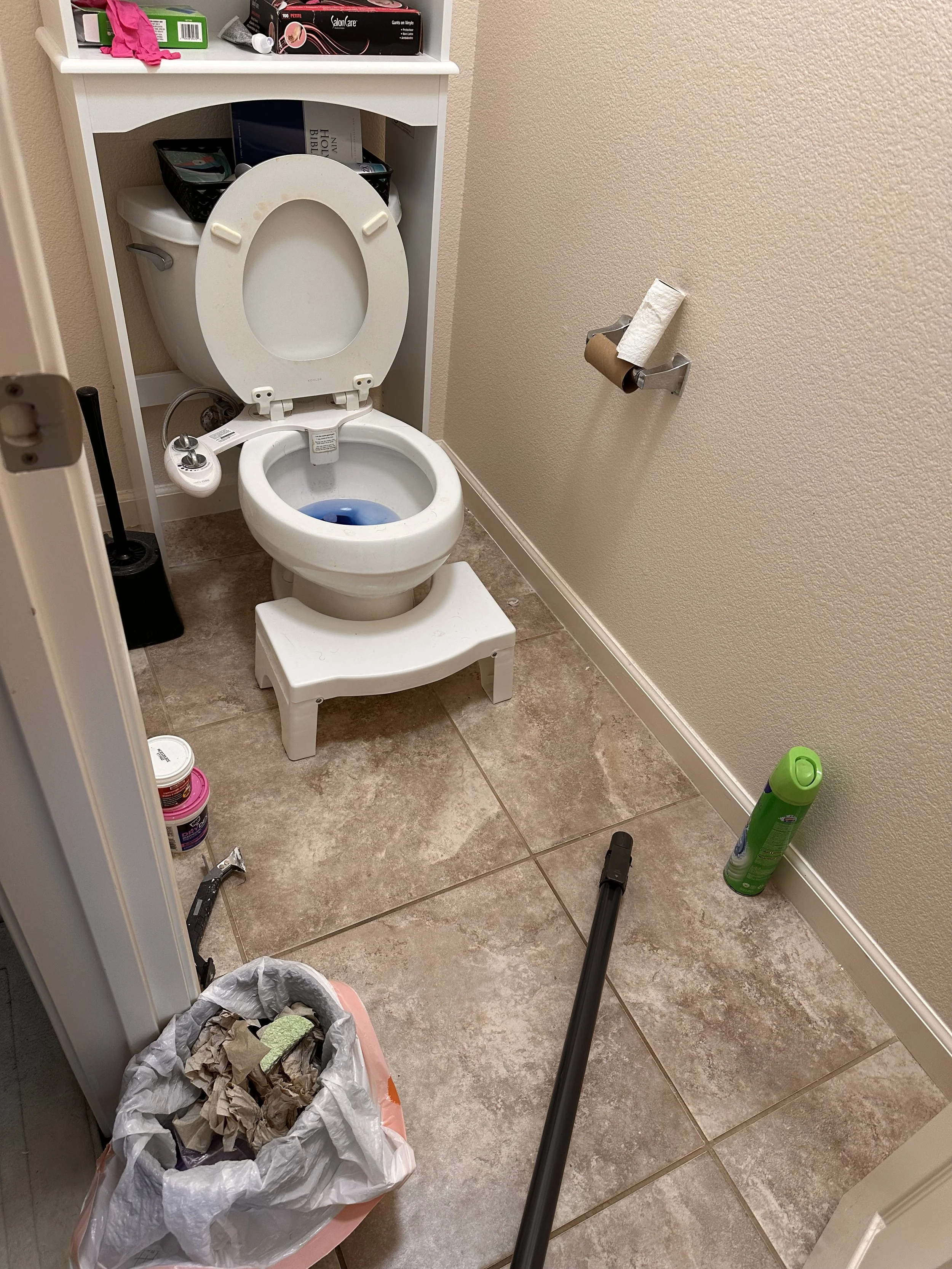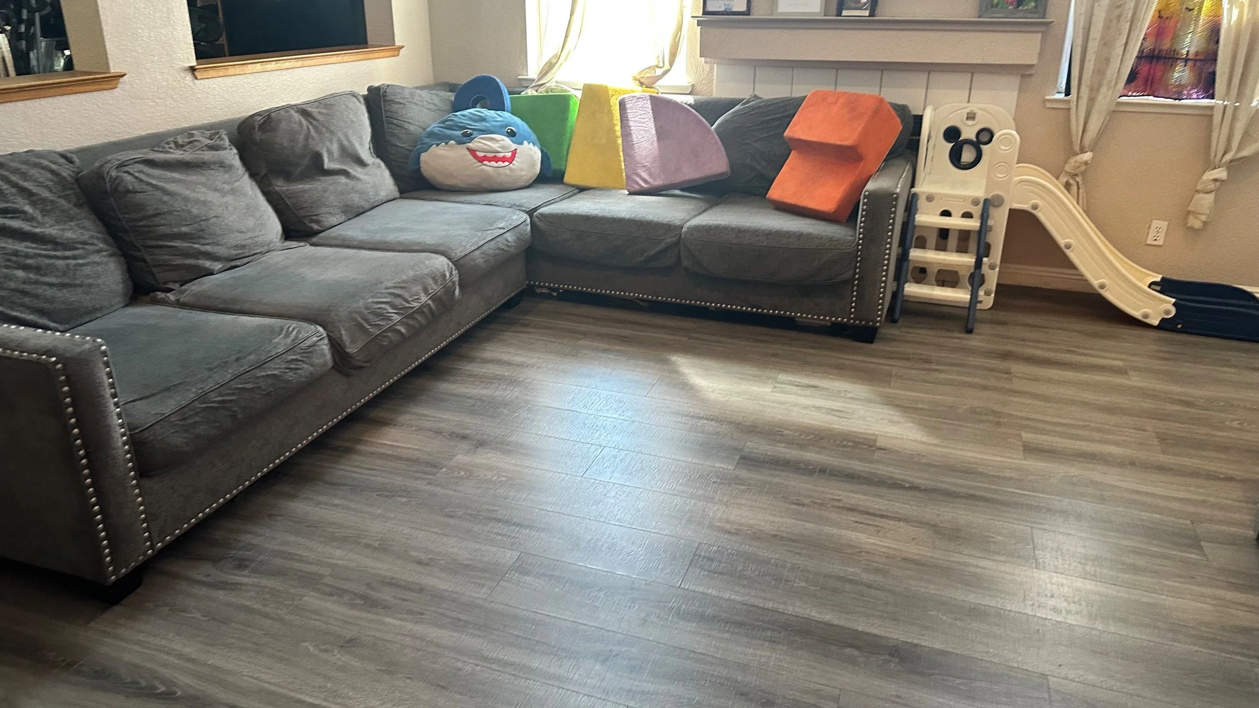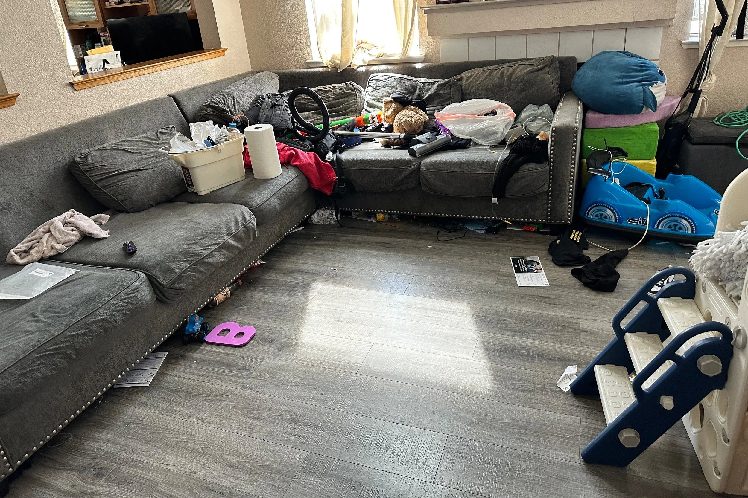 Person cleaning with a blue duster near a tan leather couch cluttered with books, papers, glasses, and a chair mat on a wooden floor.