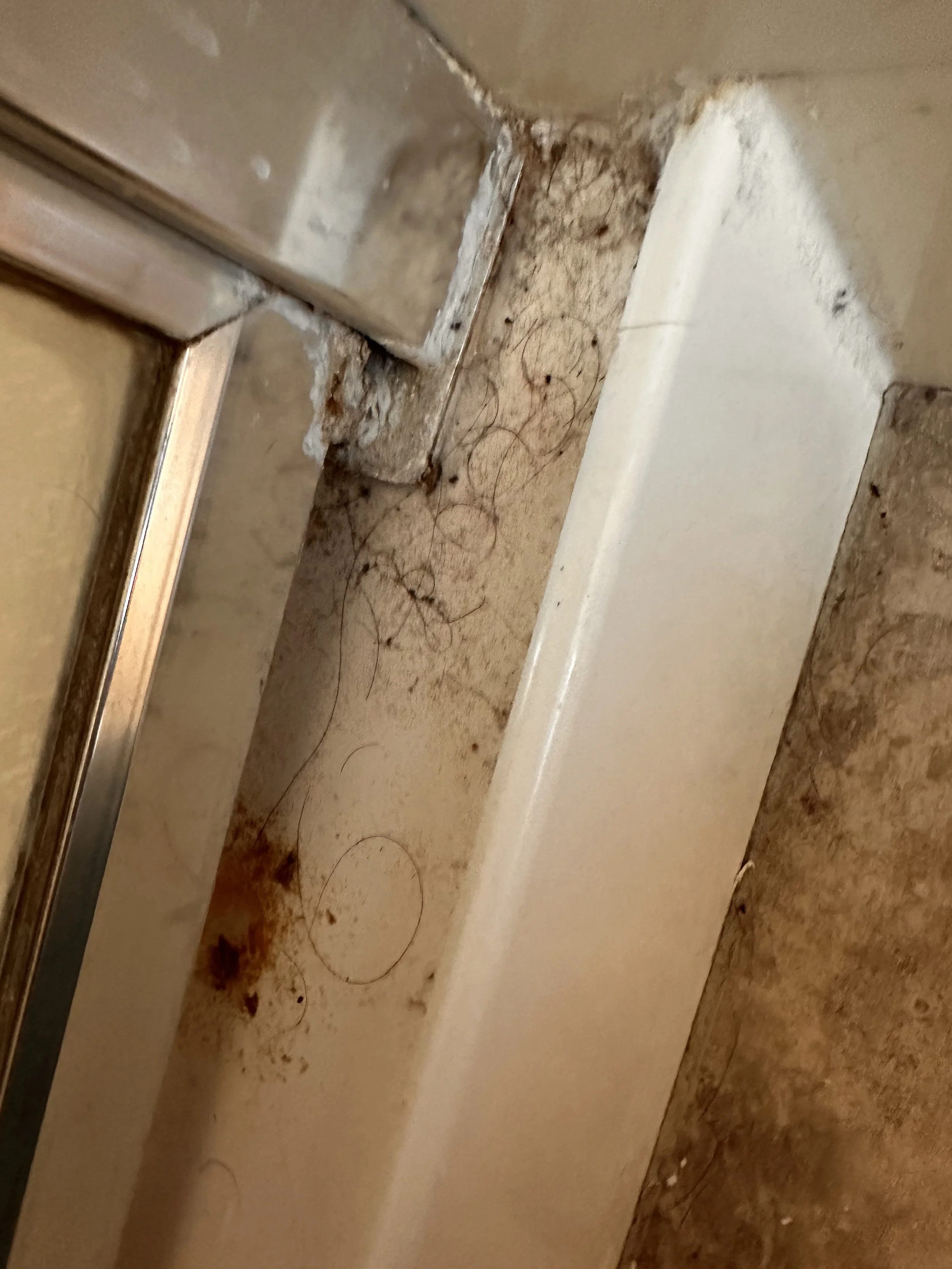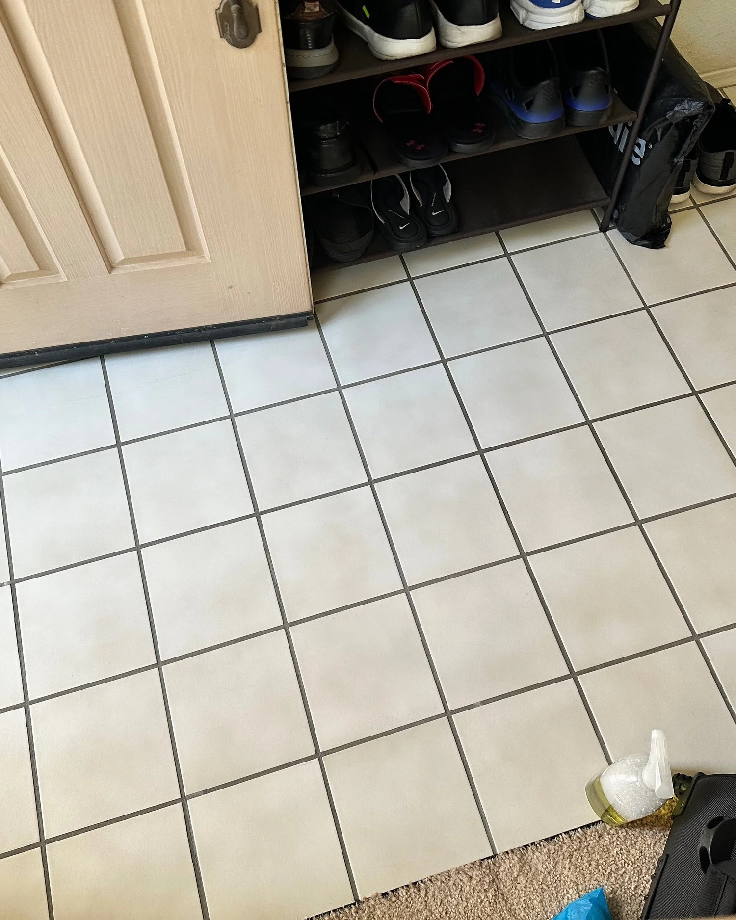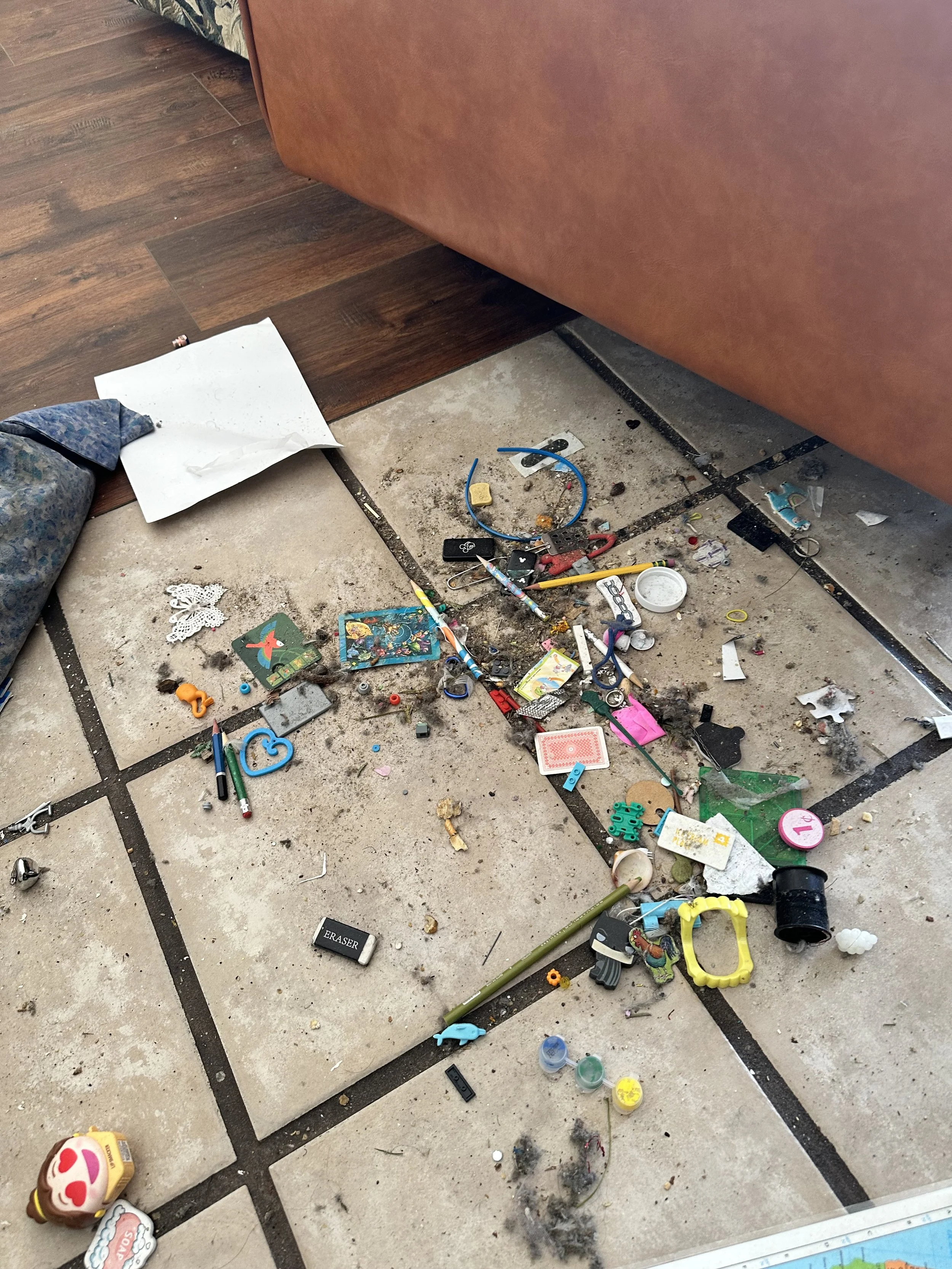 A messy collection of small items and debris under a brown couch, including an eraser, toys, papers, a playing card, and various small objects on a tiled floor.