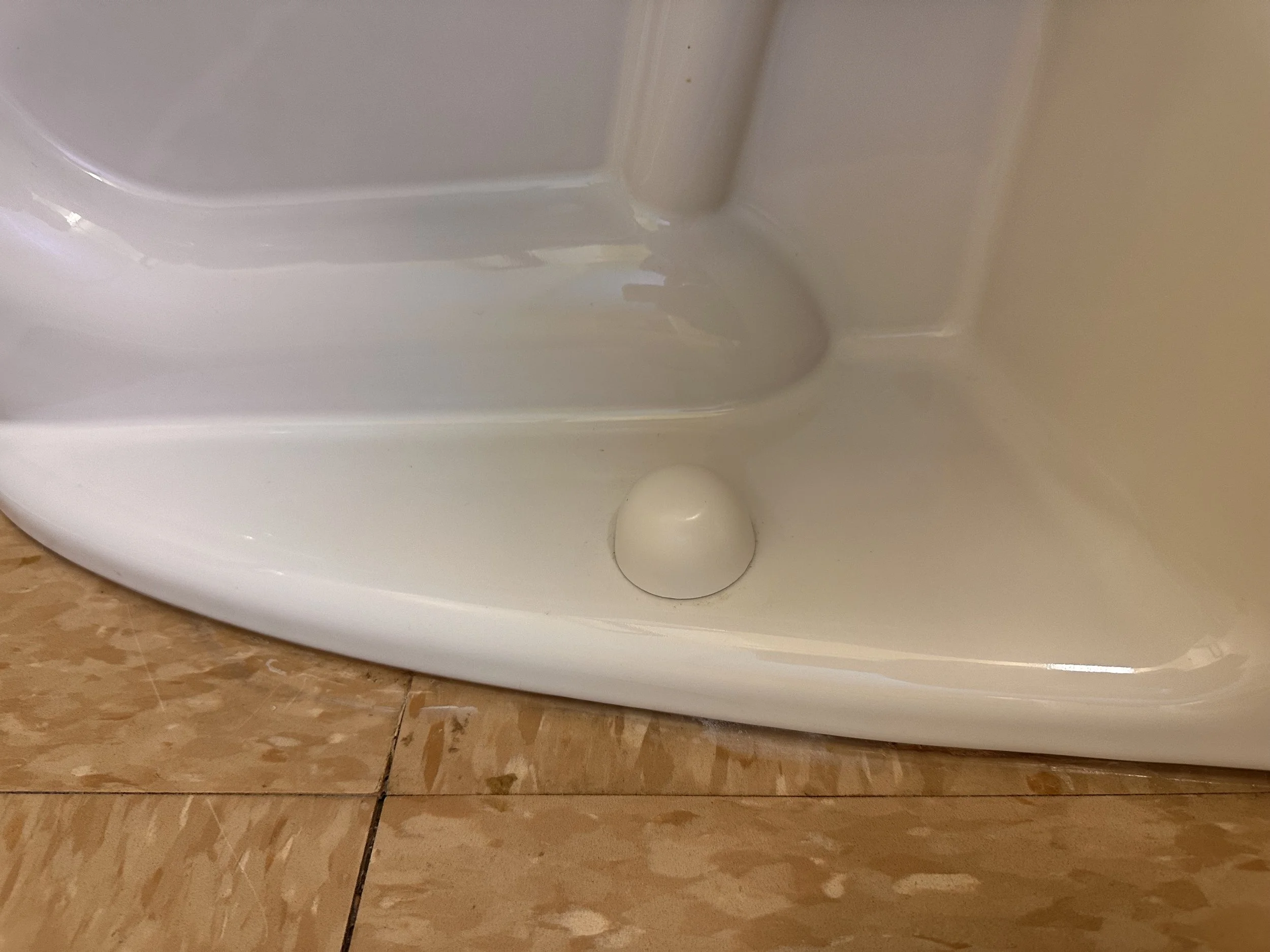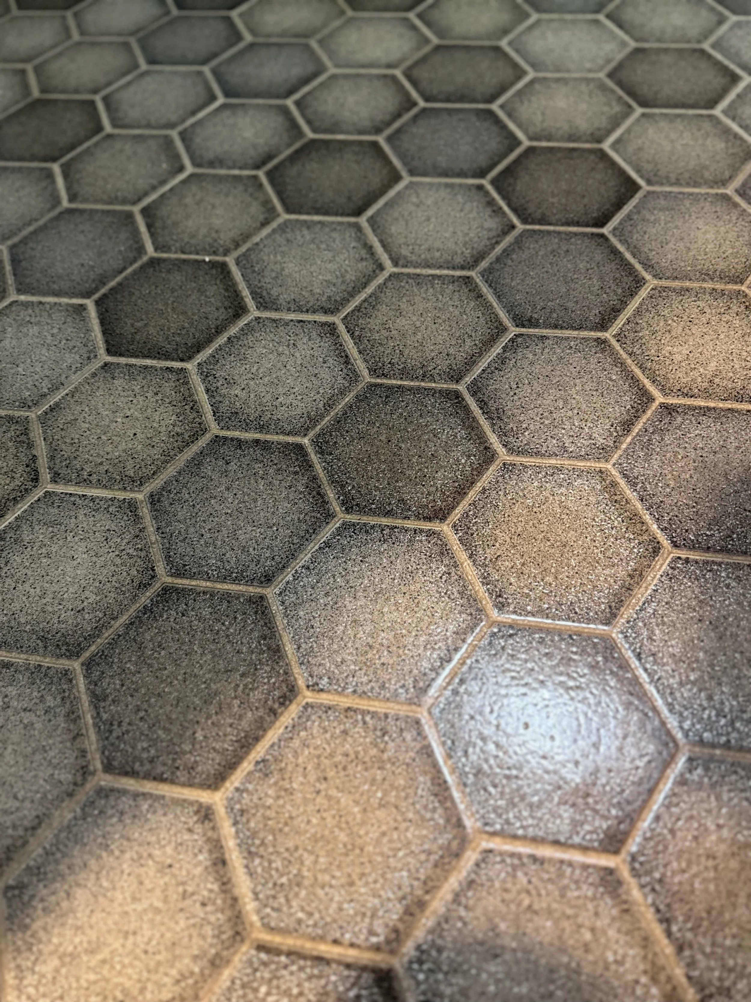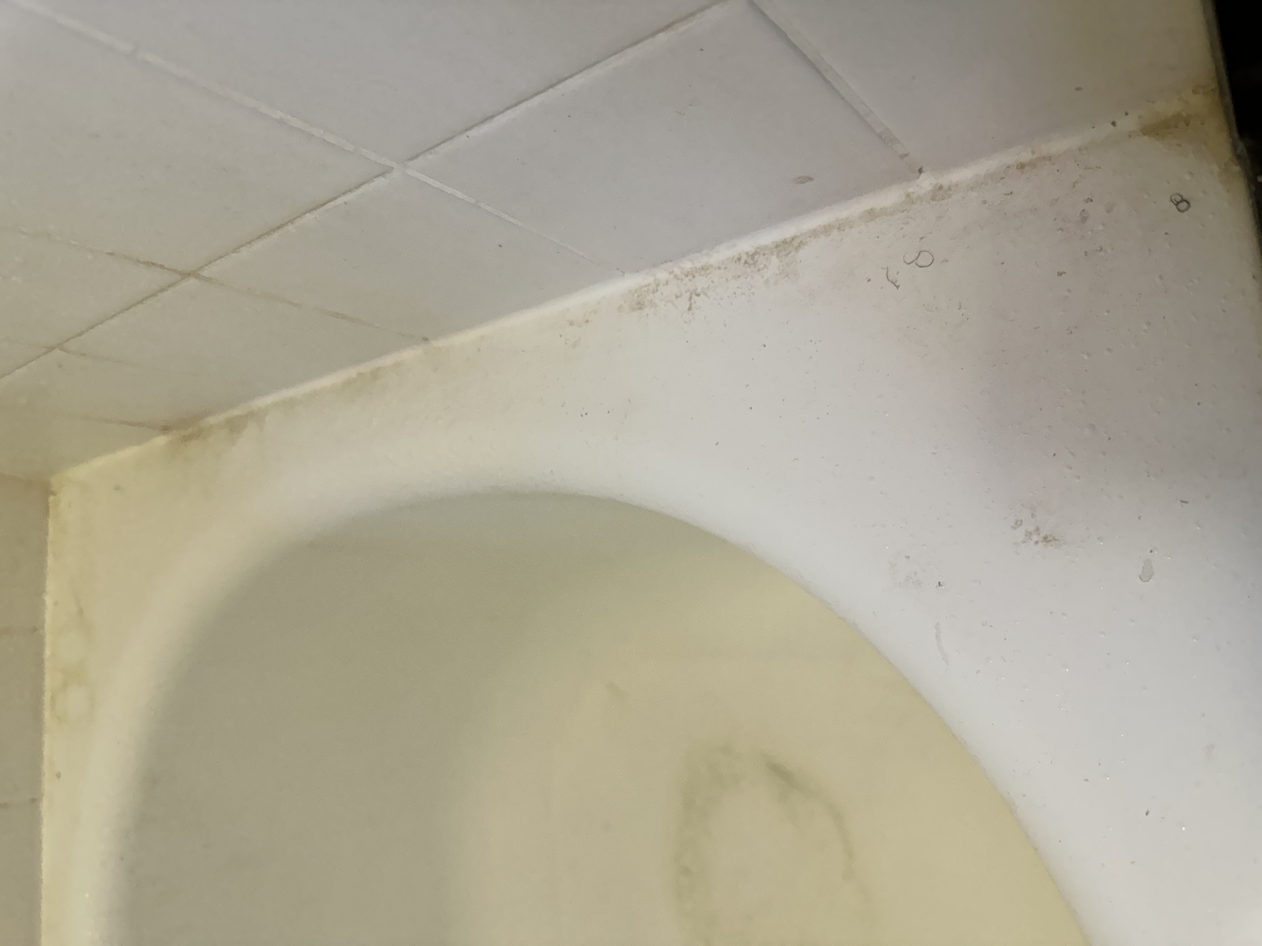 A messy collection of small items and debris under a brown couch, including an eraser, toys, papers, a playing card, and various small objects on a tiled floor.