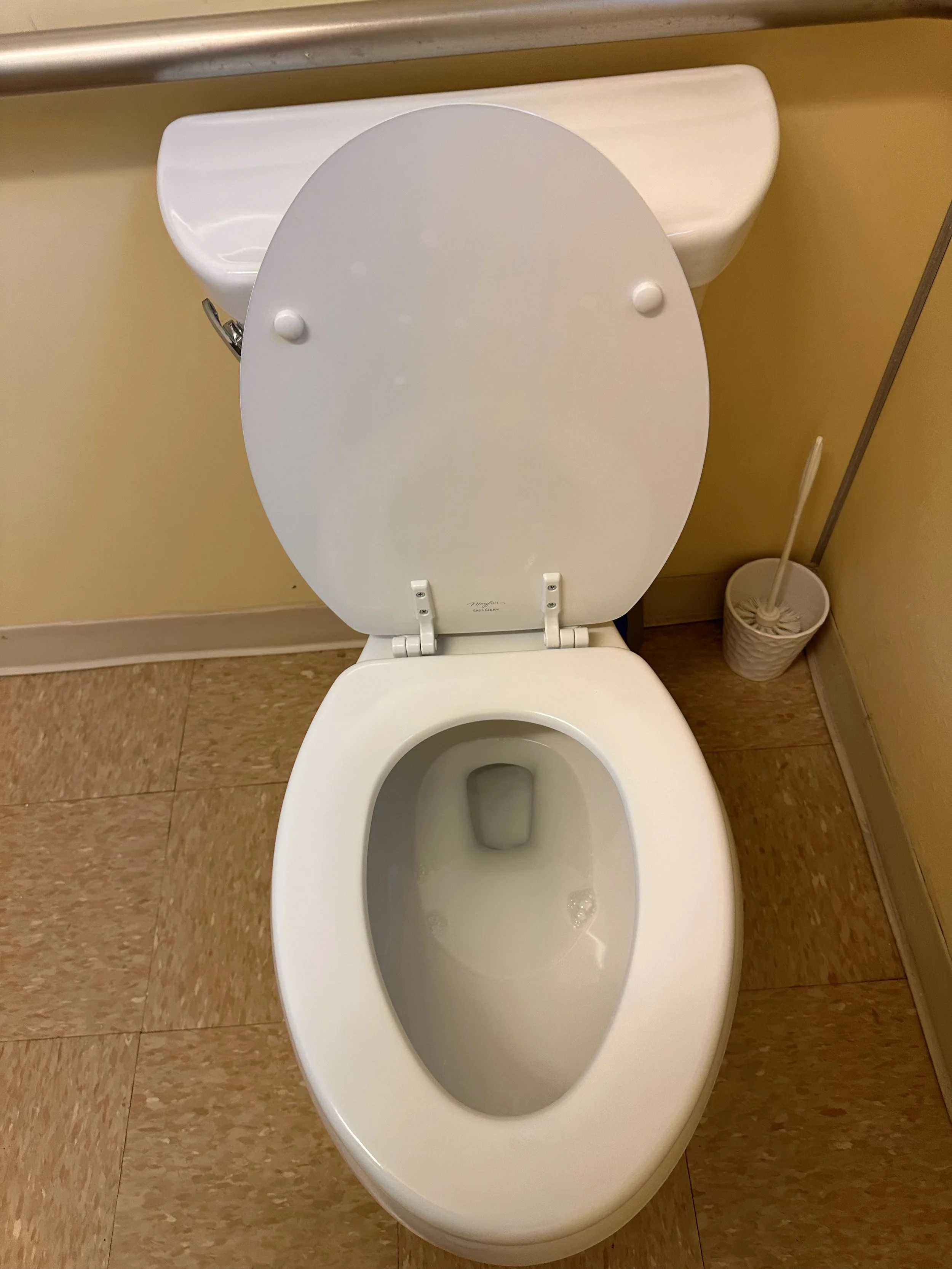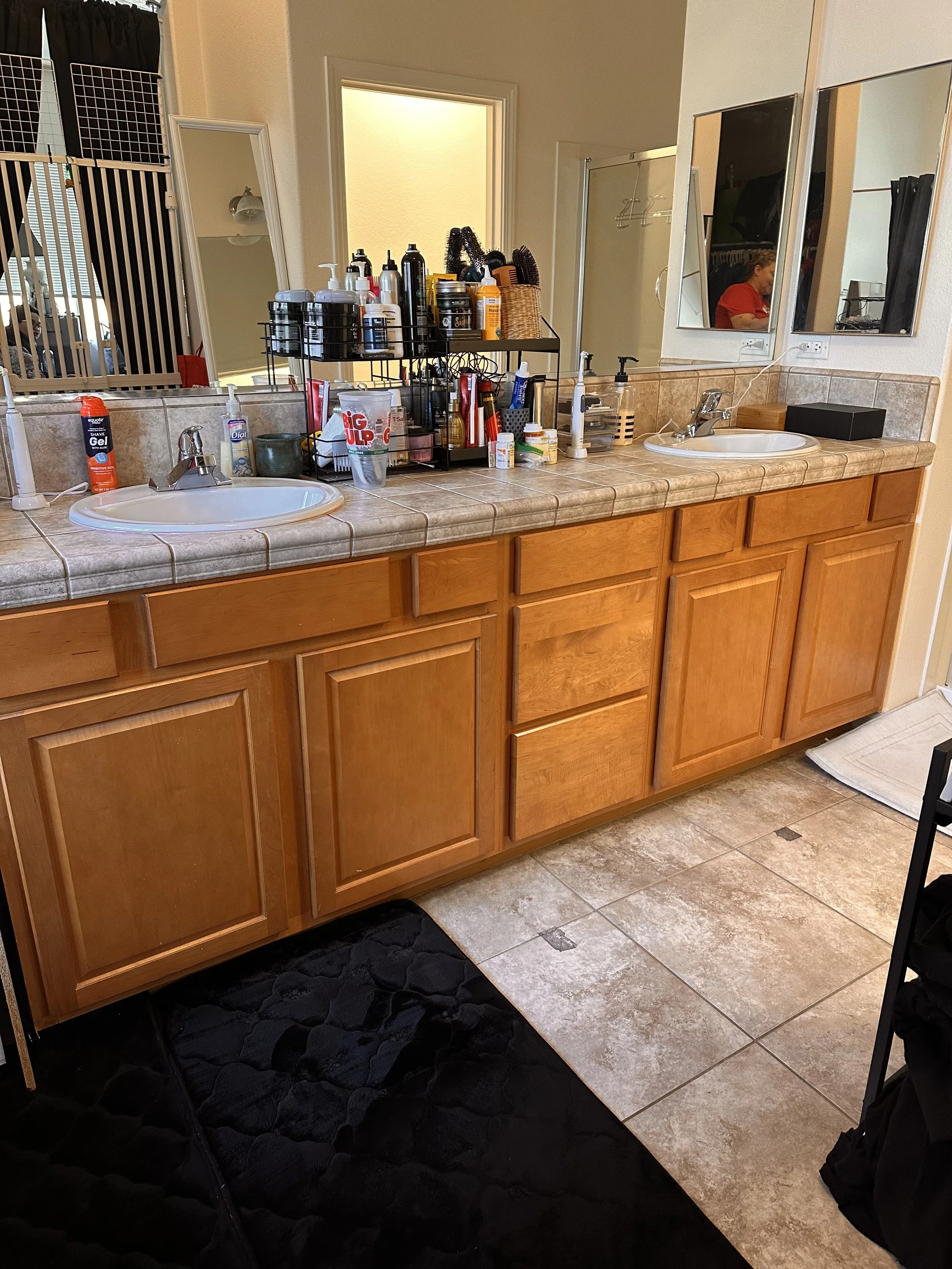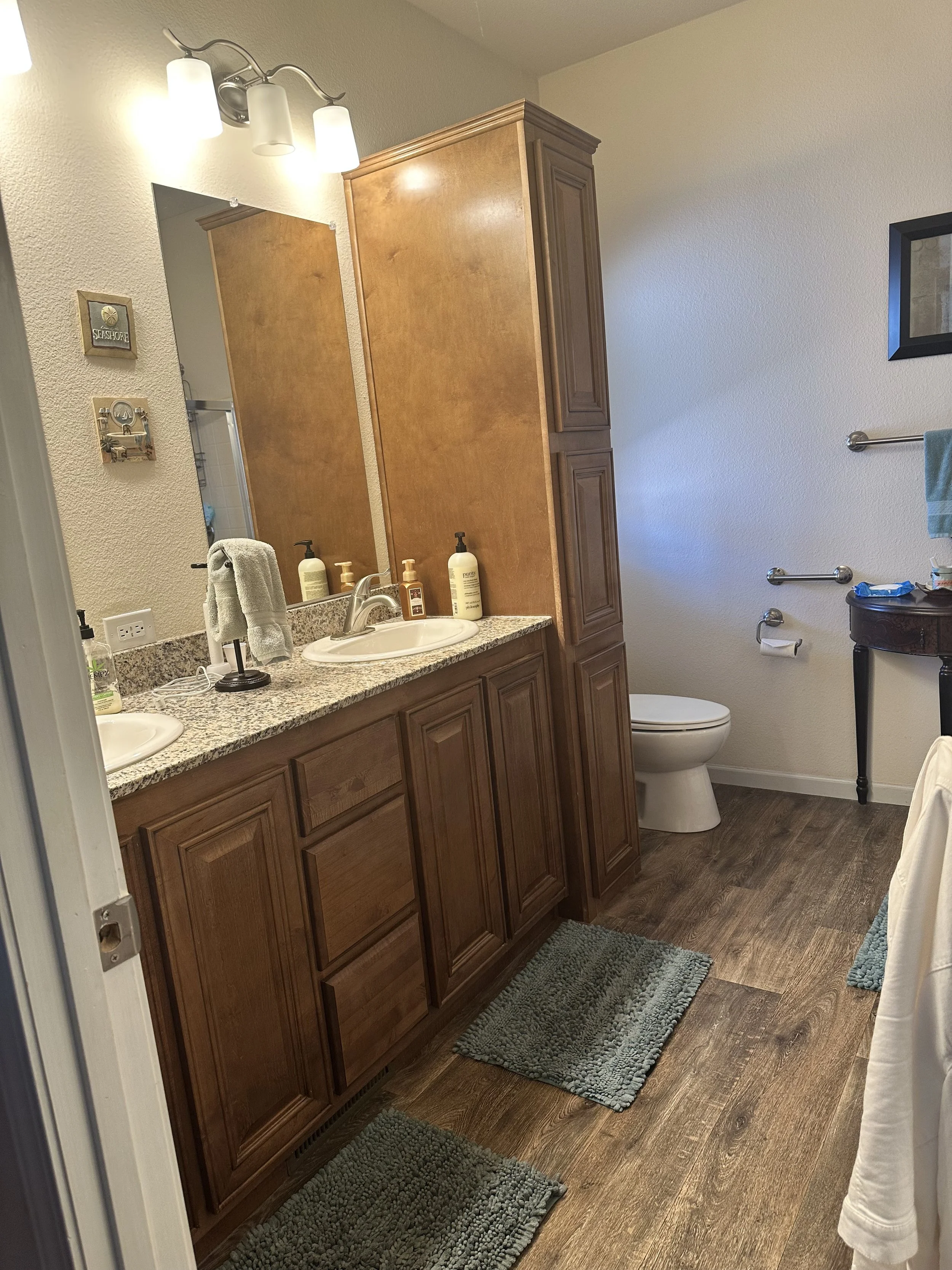 Modern bathroom with wood cabinets, granite countertop, double sinks, and a large mirror, featuring wooden flooring and green rugs. Includes a toilet and towel holder.