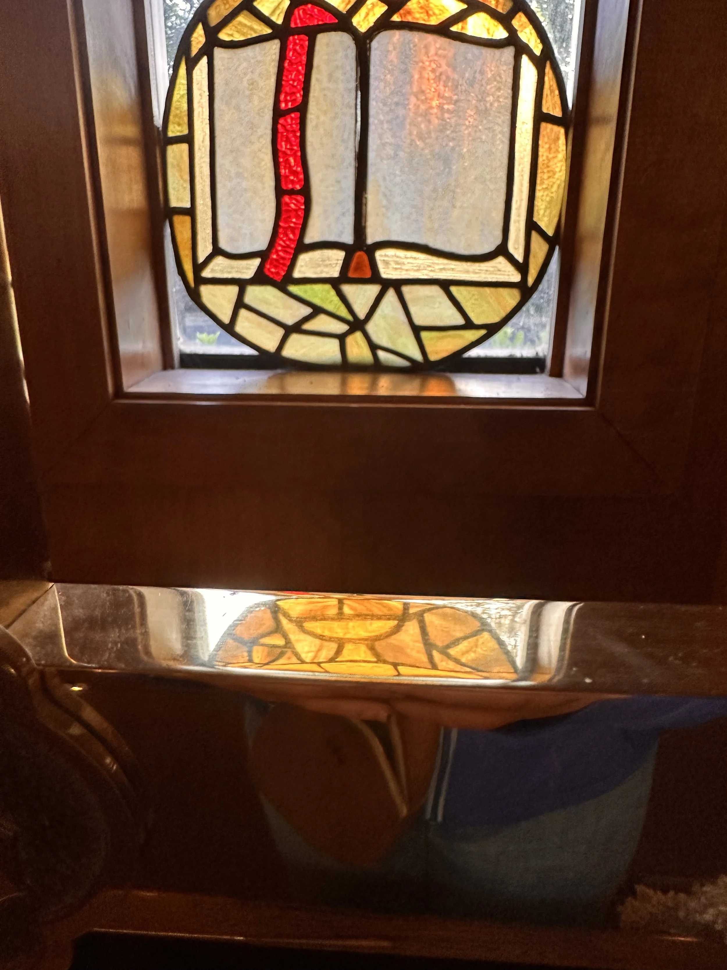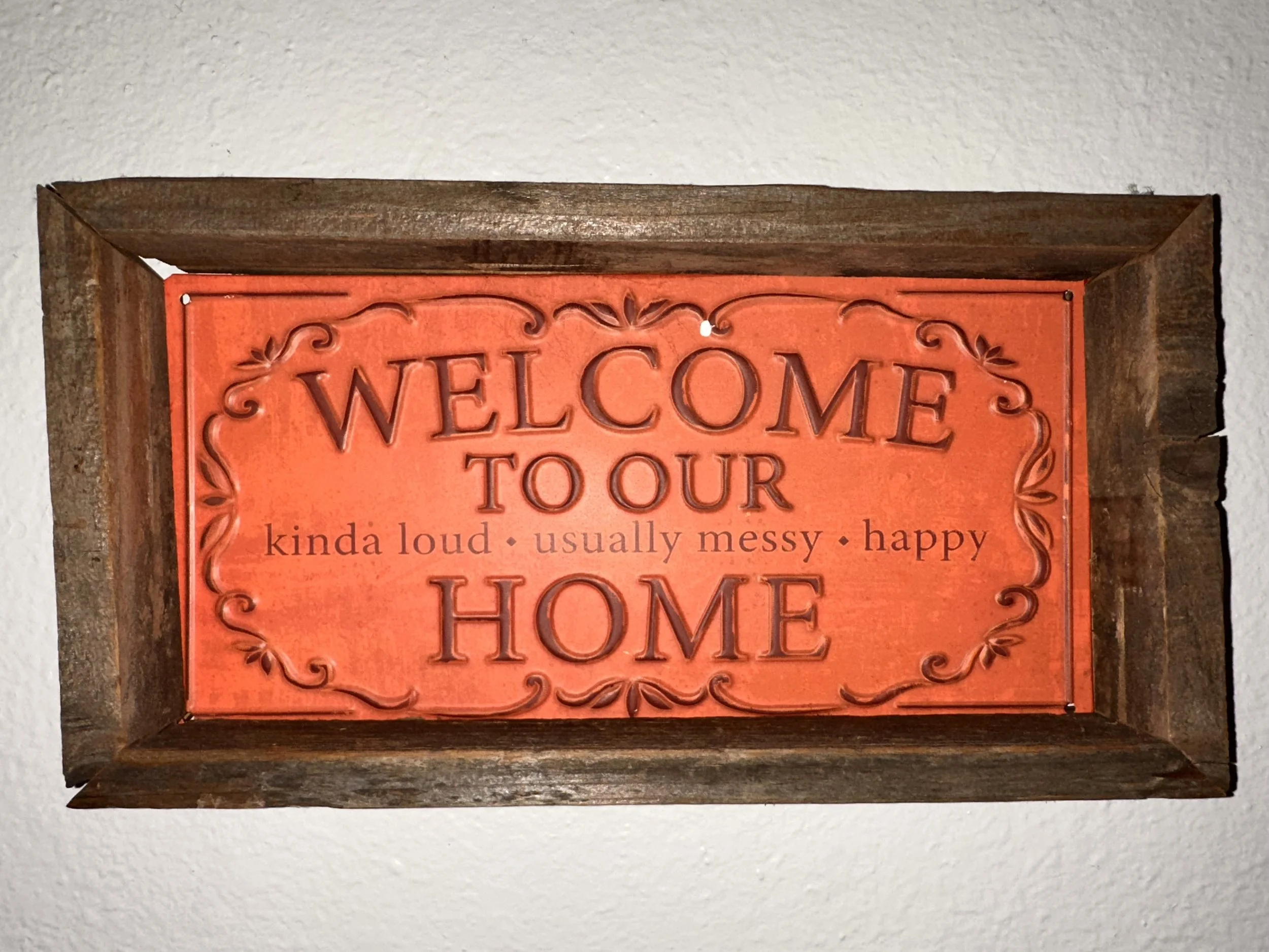 A modern kitchen featuring wooden cabinets, stainless steel appliances, and a granite countertop island with a variety of decorative items. Wall adorned with crosses. Wooden flooring and pendant lights above the island.