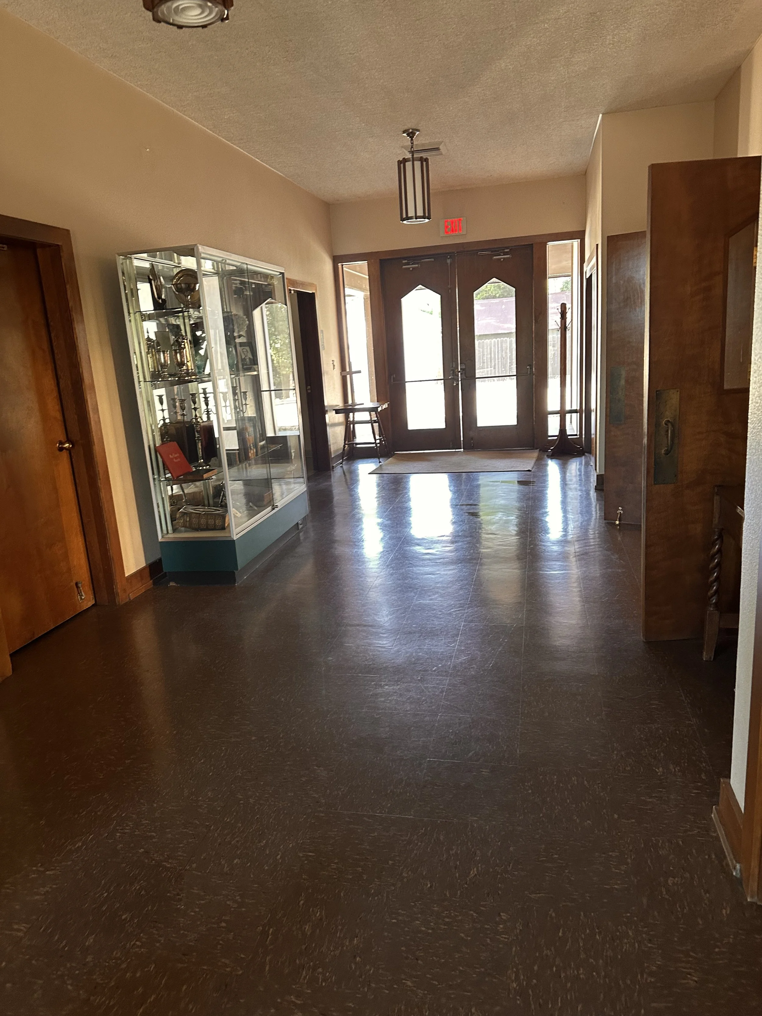 Front porch with green siding, wooden double doors, numbered steps "297", a white column, and a wooden rocking chair.