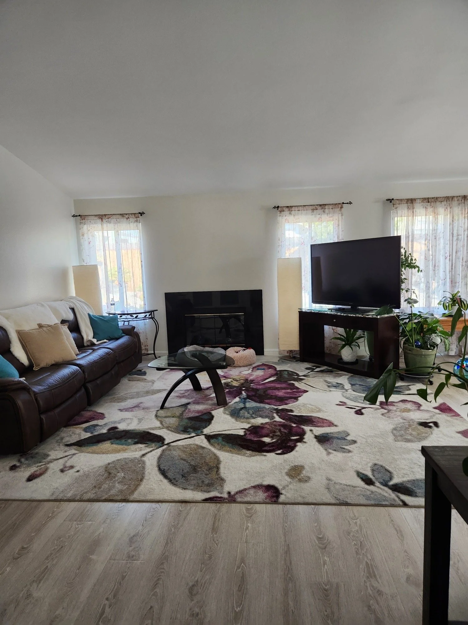Living room interior with a brown leather sofa, floral area rug, glass top coffee table, flat-screen TV, and plants, featuring light wood flooring and sheer curtained windows.
